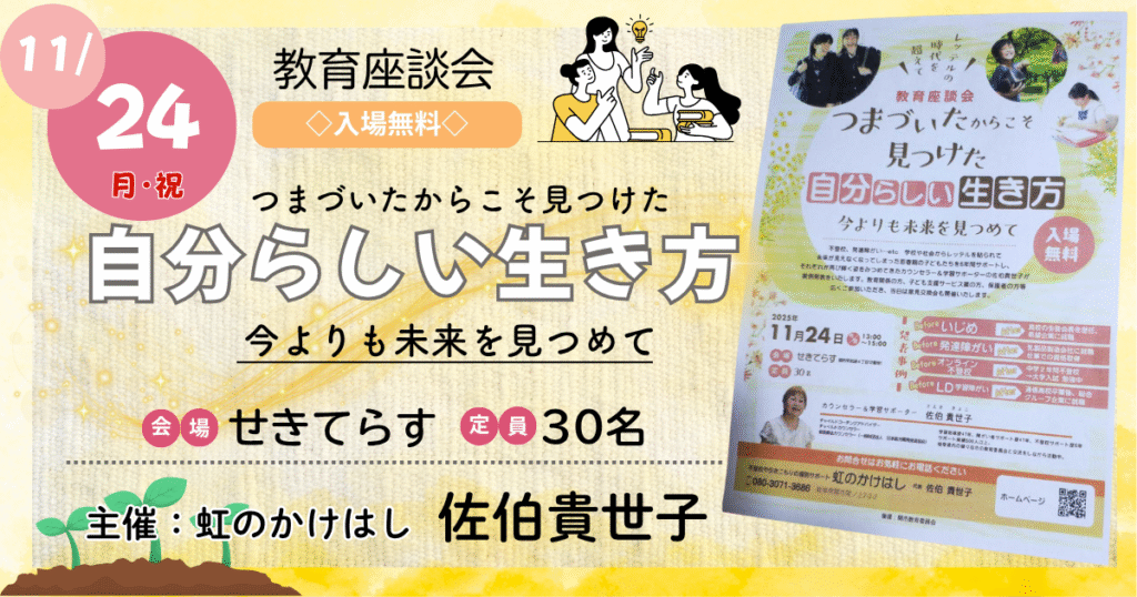 関市🍀11月24日:〜教育座談会〜つまづいたからこそ見つけた【自分らしい生き方】今よりも未来を見つめて《入場無料》主催:虹のかけはし